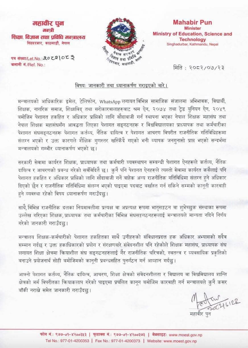 - प्राध्यापक तथा शिक्षकहरु राजनीतिक गतिविधिमा संलग्न भए कारबाही गर्ने शिक्षामन्त्री पुनको चेतावनी
