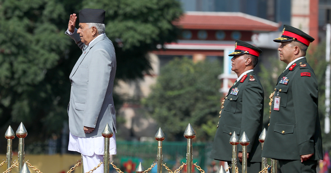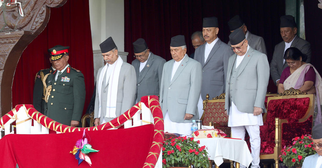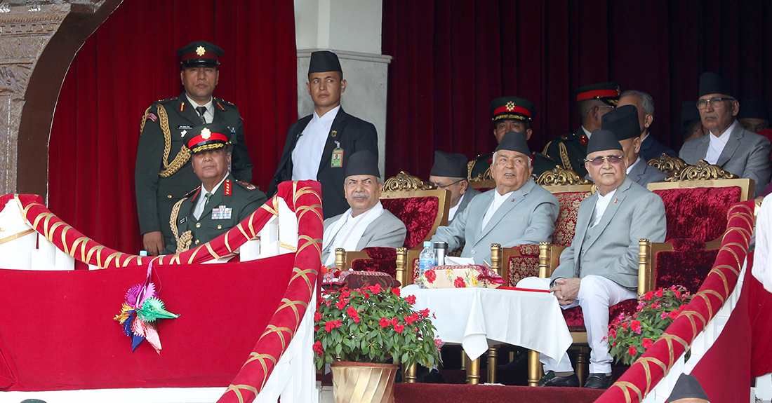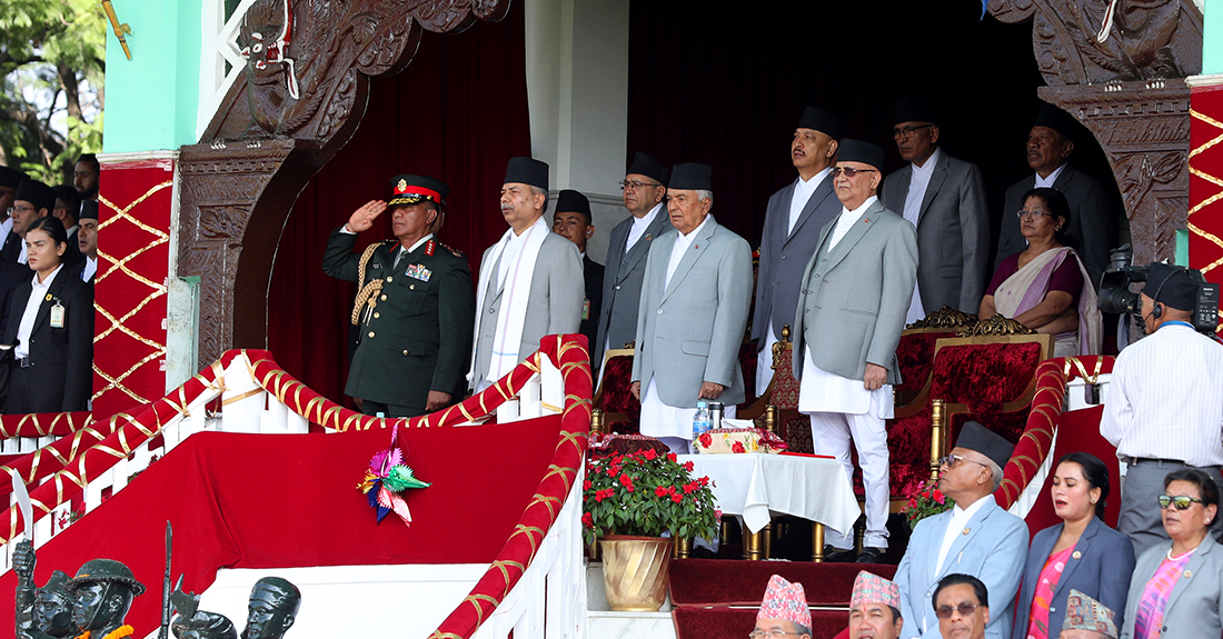 काठमाडौँ । संविधान दिवस दिन काठमाडौँको टुँडिखेलमा विशेष समारोह आयोजना गरिएको छ । उक्त कार्यक्रममा नेपाली सेनाले परेड प्रस्तुत गरेको छ । त्यस्तै नेपाली सेनाको हेलिकप्टरमार्फत पुष्पवृष्टि गरिएकाे छ ।  संविधान दिवस मूल समारोहमा राष्ट्रपति रामचन्द्र पौडेल, उपराष्ट्रपति रामसहायप्रसाद यादव, प्रधानमन्त्री केपी शर्मा ओलीलगायत उच्च पदस्थहरु सहभागी छन् ।